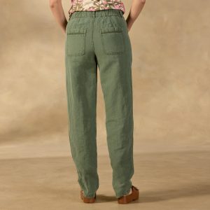 Step into comfort with our relaxed fit barrel leg pants with easy flat front and elastic back waist for the perfect fit. Front pintuck details. two front slash pockets. two back patch pockets and a removable waistband tie. Cotton/linen. Machine wash. Imported. Exclusive. Sizes 0-14. 24.5 inseam.