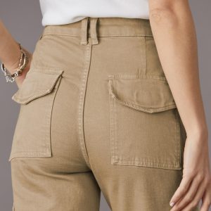 The perfect everyday cargo pants. in stretchy denim with exposed seaming and seven pockets. Organic cotton/spandex. Machine wash. USA. Sizes 24-32. 32 inseam; 11.75 rise; 16 leg opening.