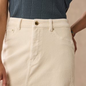 This versatile. corduroy midi skirt is high-waisted and features traditional five-pocket styling. tonal stitching and a front slit. Cotton/lycra. Machine wash. Imported. Sizes 24?C32. Approx. 26.5l.