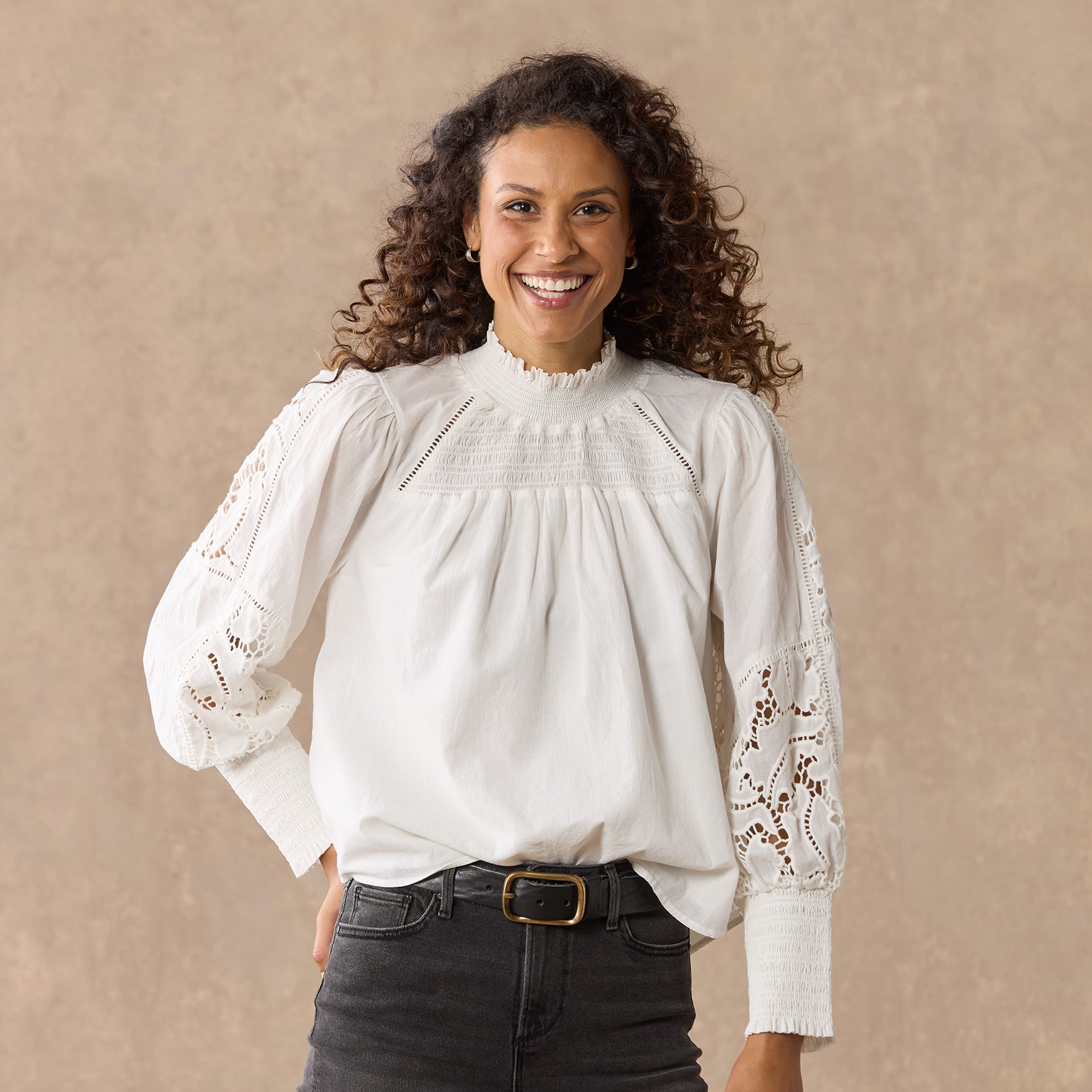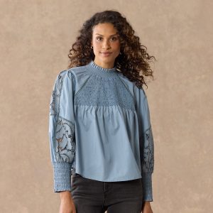 This ultra-feminine silhouette features smocking at the yoke and cuffs. ladder lace. lace insets and a ruffle at the neck. Cotton. Hand wash. Imported. Sizes XS (0–2). S (4–6). M (8–10). L (12–14). XL (16–18). Approx. 23.25l.