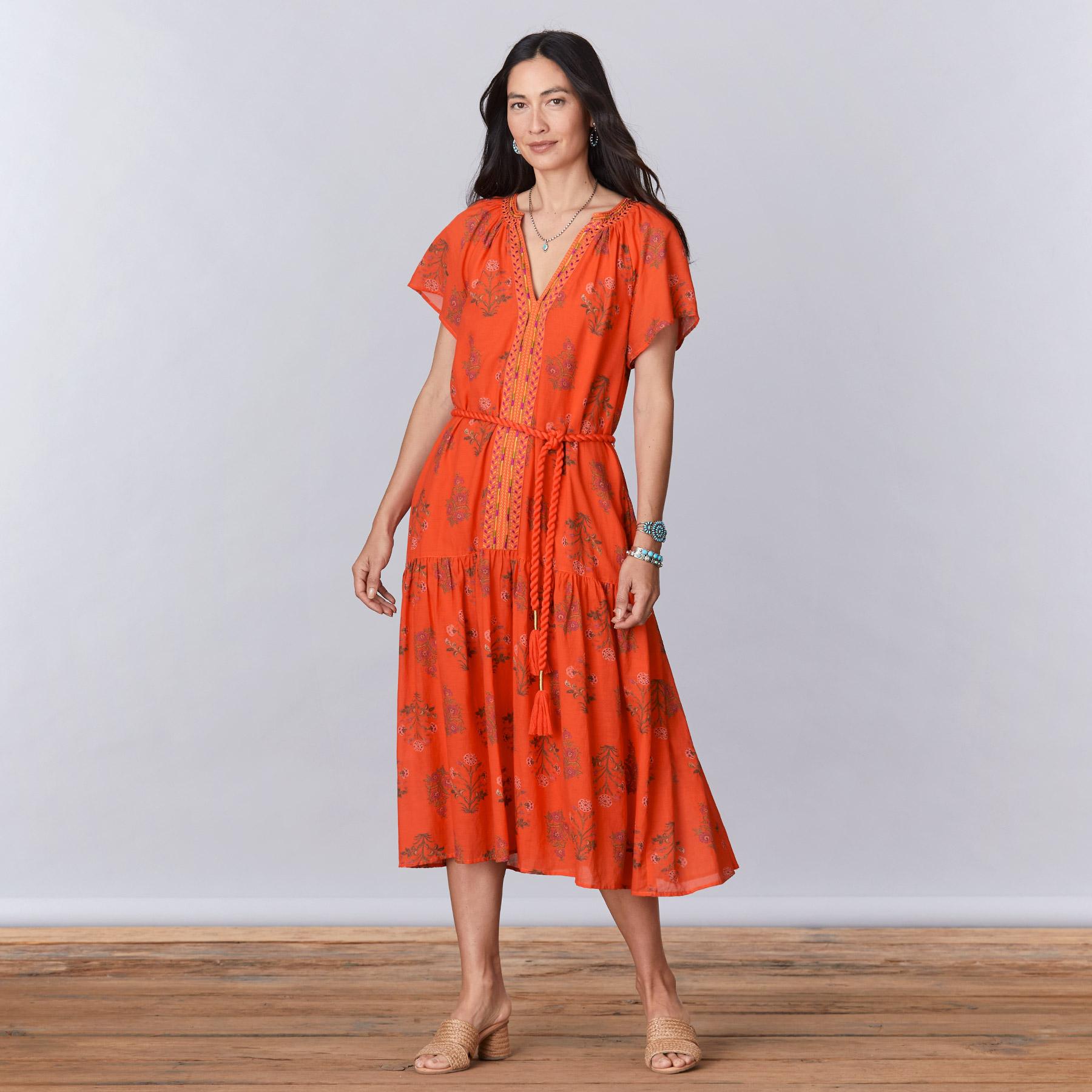 An ode to summer. our easy. flowing. floral print dress with geometric embroidery detail at neckline and placket. With one tier. flutter sleeves. notch neckline. side seam pockets and a removable ring loop rope belt. Lined. Cotton/viscose. Machine wash. Imported. Exclusive. Sizes XXS (00). XS (0?C2). S (4?C6). M (8?C10). L (12?C14). XL (16?C18). Approx. 45l.