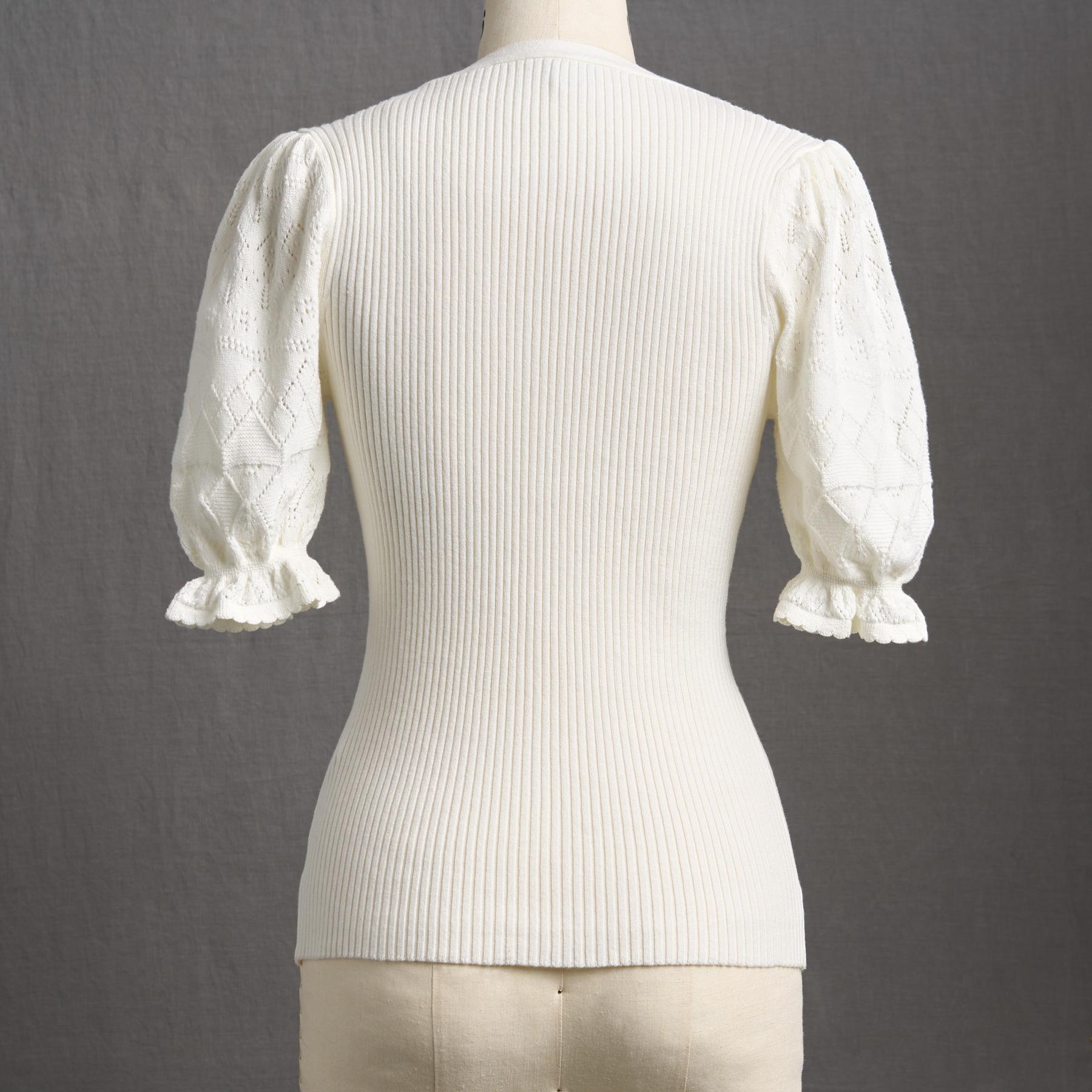 Experience the essence of luxury in our feminine and fitted V-neck henley. so soft in our Legends Lightweight Yarn. Beautiful pointelle at the bold puff sleeves and special scalloped trim details add an extra touch of grace. Organic cotton/nylon/spandex. Machine wash. Imported. Exclusive. Sizes XXS (00). XS (0?C2). S (4?C6). M (8?C10). L (12?C14). XL (16?C18). Approx. 20.5l.